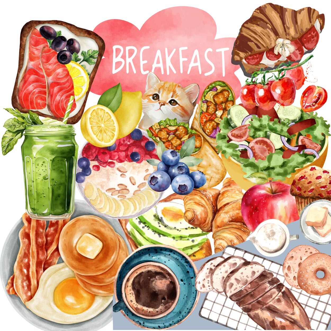 猫T(おいしい朝食)が新登場!1日の始まりに朝食は大切です!栄養いっぱいの美味しい朝ごはんをたくさん詰め込んだ、魅力的な一枚です。可愛い猫ちゃんも美味しい朝食を見上げています。このTシャツを着て、朝のひとときを心豊かに過ごしましょう!