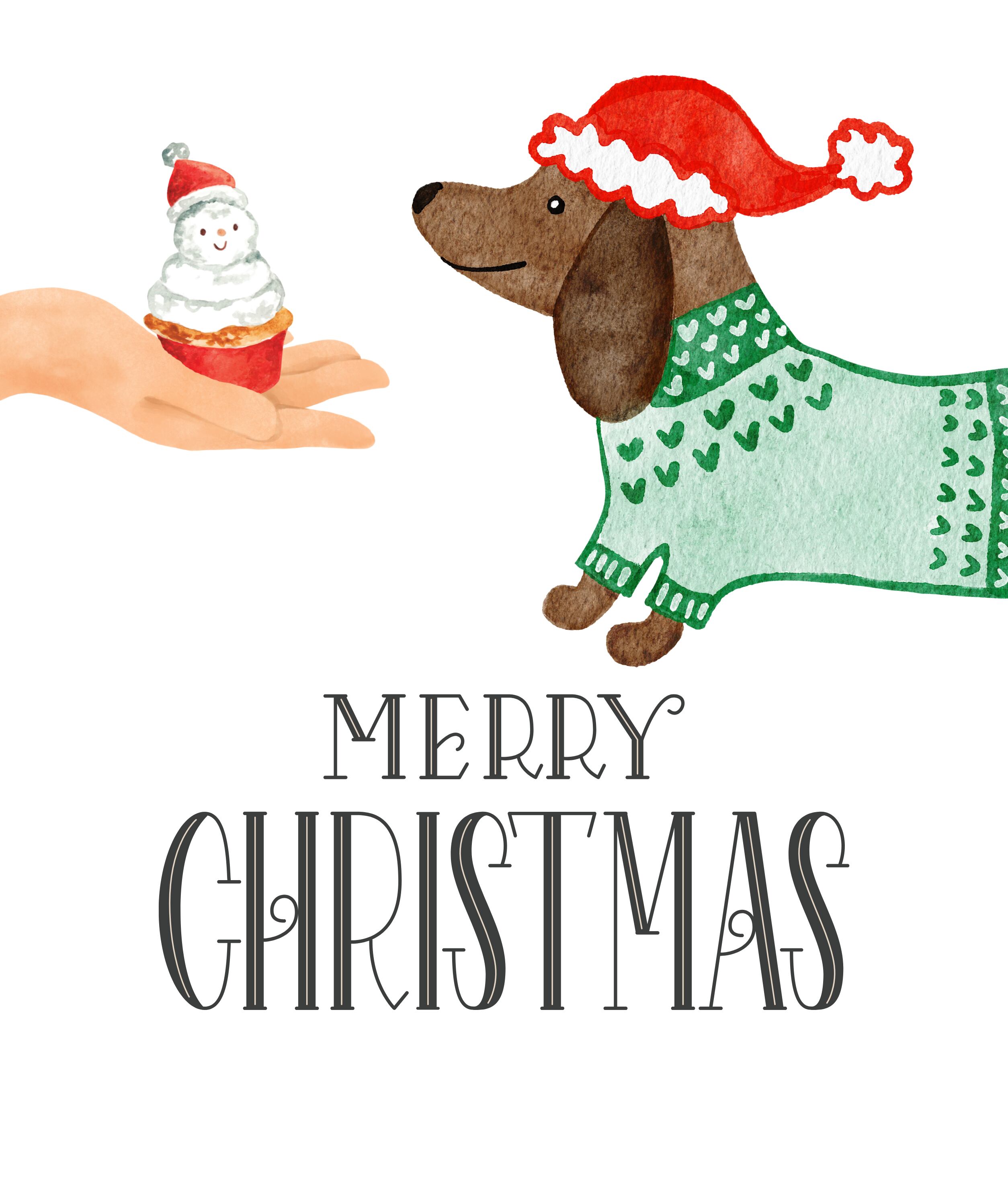 可愛いダックスフンドがサンタさんカップケーキをプレゼントされている、「ダックスクリスマス」が登場!犬用カップケーキをつくる飼い主さんのあなたにも、メリークリスマス!