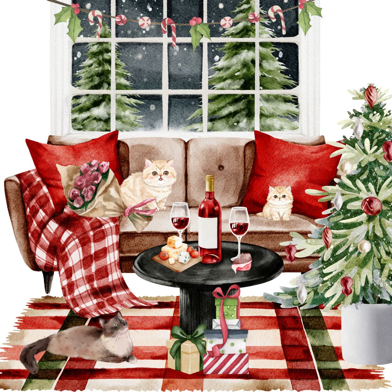 暖かいお部屋に3匹の猫たち。おいしいワインとチーズはいかがですか?落ち着いたクリスマスの夜を過ごしたいあなたにぴったりの「ハッピークリスマス」シャツです。